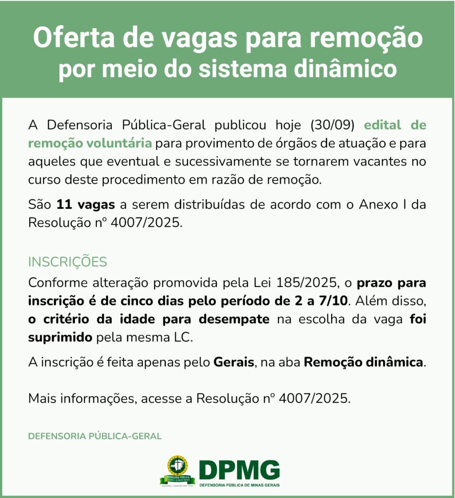 30/09/2025 Defensoria-Geral divulga edital de remoção voluntária. Clique aqui para ler a Resolução n° 4007/2025 Assista ao tutorial.