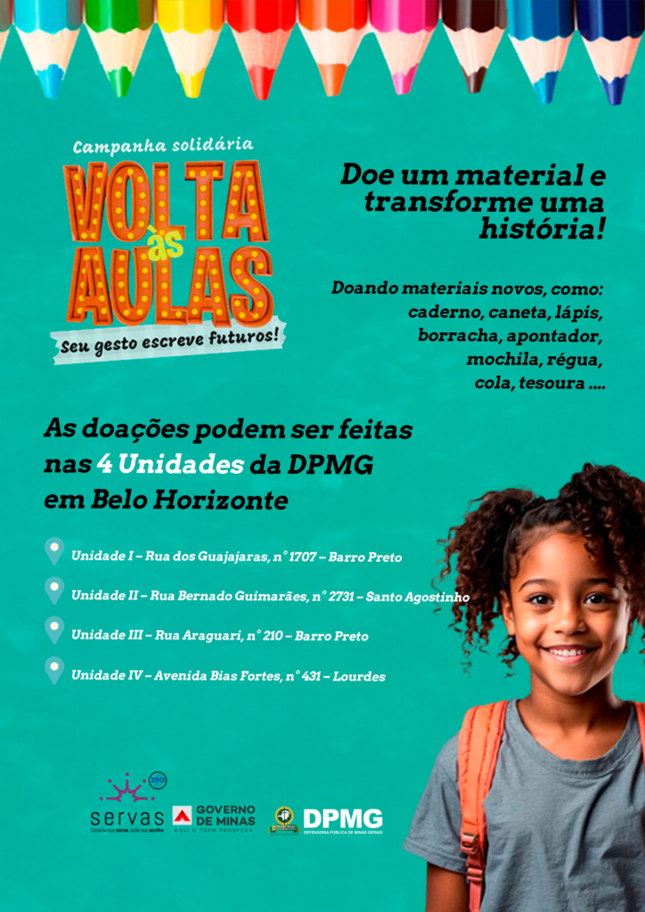 A Defensoria Pública de Minas Gerais (DPMG) aderiu à campanha Volta às Aulas 2026, mobilização solidária promovida pelo Servas, com o apoio de instituições públicas, empresas, escolas particulares e da sociedade civil, para fortalecer a educação e promover a equidade no acesso ao ensino para crianças e adolescentes em situação de vulnerabilidade social.