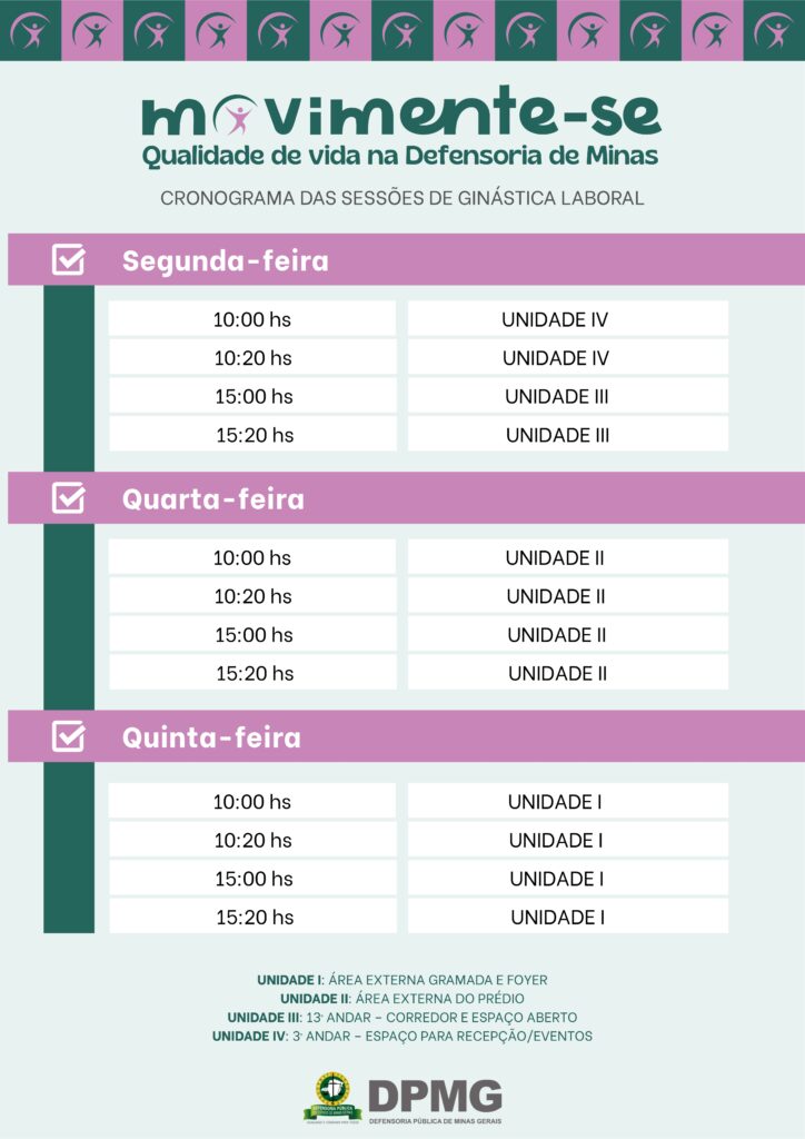 Promovido pela Superintendência de Gestão de Pessoas e Saúde Operacional (SGPSO), o projeto Movimente-se na Defensoria de Minas tem como objetivo incentivar hábitos saudáveis e promover o bem-estar de todos os integrantes da Instituição.