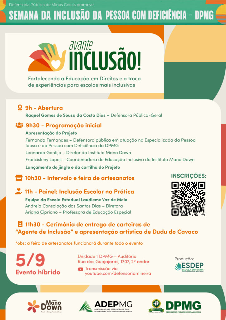 A Defensoria Pública de Minas Gerais (DPMG) e o Instituto Mano Down estão unidos em prol de um sistema educacional inclusivo. As instituições estão dando início ao projeto “Avante Inclusão! Fortalecendo a Educação em Direitos e a Troca de Experiências para Escolas mais Inclusivas”. A iniciativa vai realizar atendimento multidisciplinar, educação em direitos e capacitações com o objetivo de promover a inclusão escolar de pessoas com deficiência.