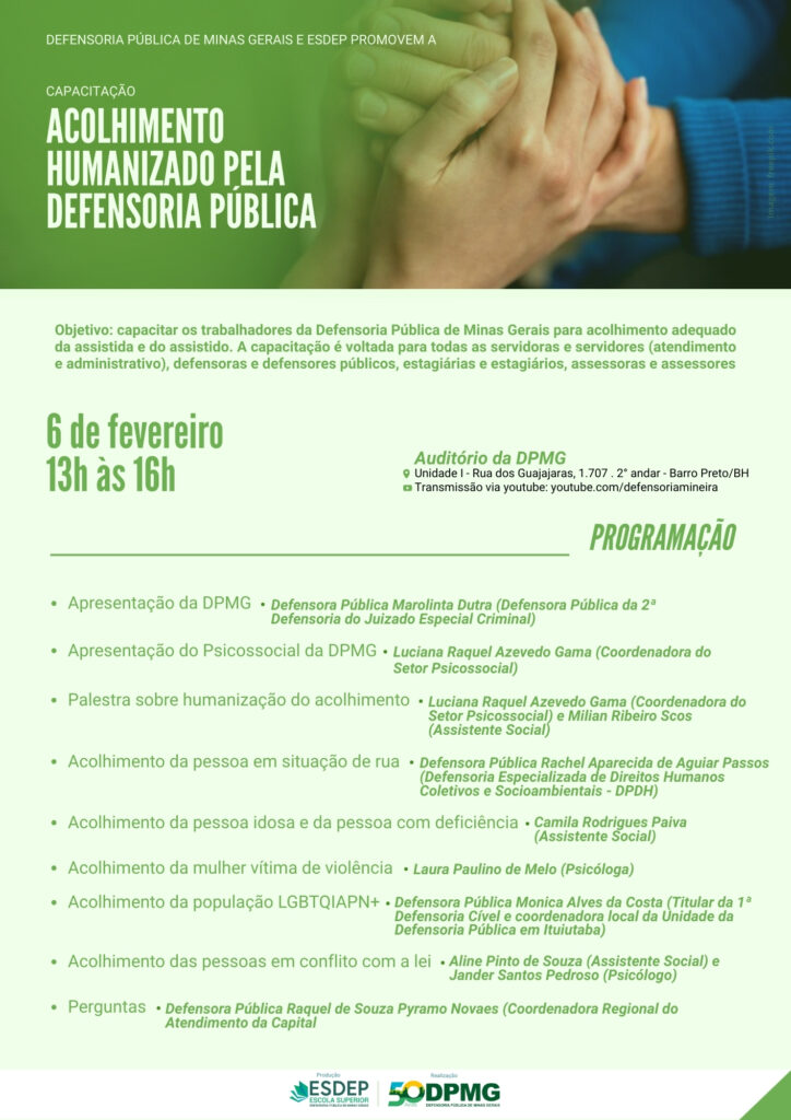 A Defensoria Pública de Minas Gerais (DPMG), por meio da sua Escola Superior (Esdep), promove no dia 6 de fevereiro, das 13h às 16h, a capacitação Acolhimento Humanizado pela Defensoria Pública. A atividade será realizada no Auditório da Defensoria Pública de Minas Gerais – Unidade I, localizado na Rua dos Guajajaras, nº 1.707, 2º andar, no bairro Barro Preto, em Belo Horizonte, com transmissão ao vivo pelo canal youtube.com/defensoriamineira.