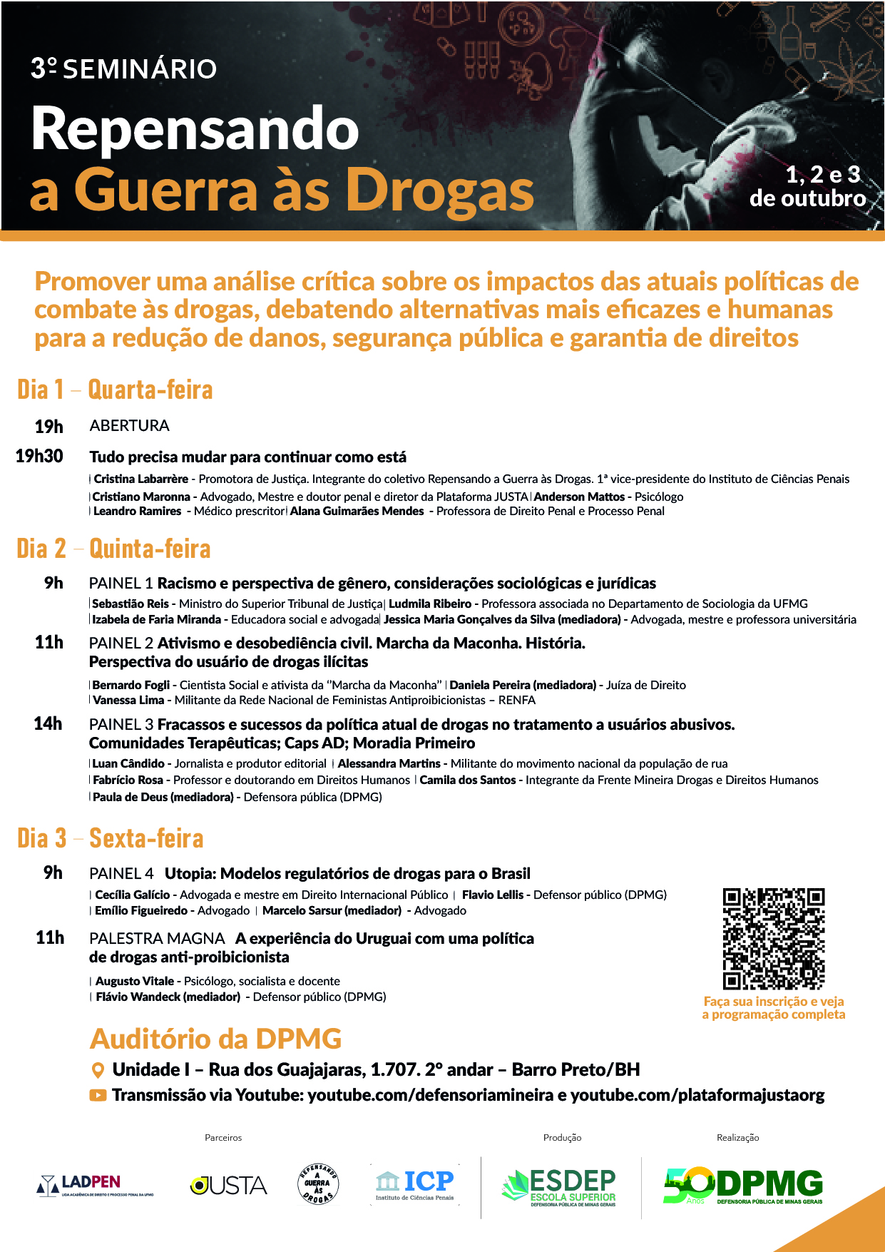 A Defensoria Pública de Minas Gerais (DPMG), por meio da sua Escola Superior (Esdep), promove, nos dias 1º, 2 e 3 de outubro, o 3º Seminário “Repensando a Guerra às Drogas”. O evento será realizado no auditório da Defensoria, em Belo Horizonte, com transmissão ao vivo pelo YouTube, e tem como objetivo fomentar uma análise crítica sobre os impactos das atuais políticas de combate às drogas, debatendo alternativas mais eficazes e humanizadas para a redução de danos, a segurança pública e a garantia de direitos.