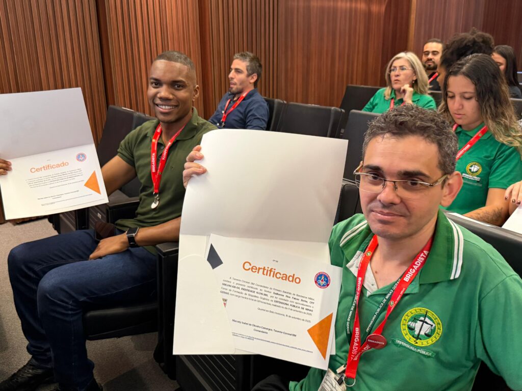 A Defensoria Pública de Minas Gerais realizou, nesta segunda-feira (29/9), a formatura do 1º grupo de brigadistas da DPMG. No total, 80 voluntários entre membros, servidores e terceirizados das unidades I, II e IV d Belo Horizonte e uma servidora da unidade de Santa Luzia, participaram do treinamento oferecido pelo Corpo de Bombeiros Militar de Minas Gerais (CBMMG).