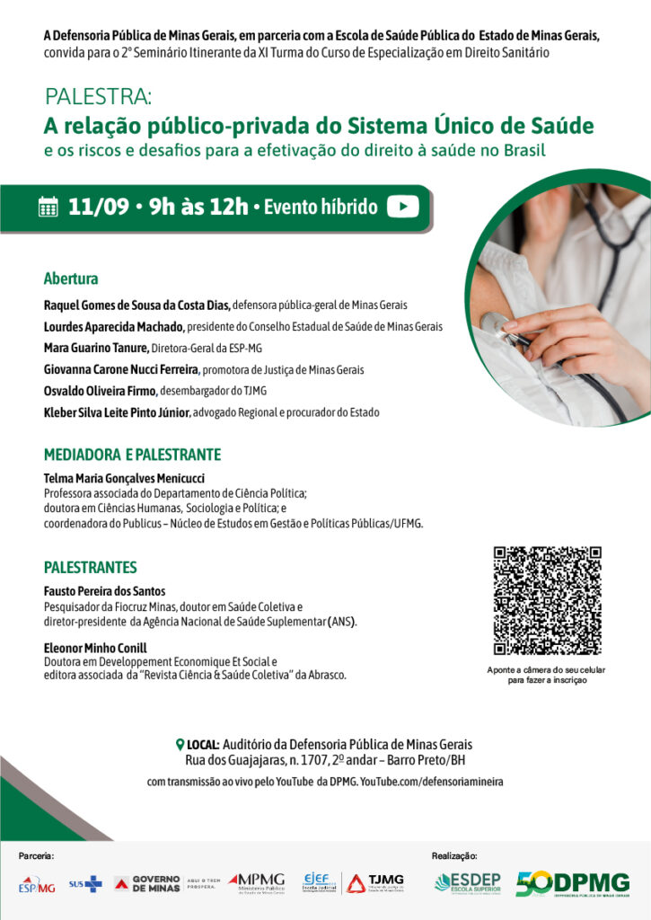A Defensoria Pública de Minas Gerais, por meio da sua Escola Superior (Esdep), em parceria com a Escola de Saúde Pública do Estado de Minas Gerais (ESP-MG), promoverá, no dia 11 de setembro, às 9h, o “Segundo Seminário Itinerante da Turma XI do Curso de Especialização em Direito Sanitário da Escola de Saúde Pública do Estado de Minas Gerais”.