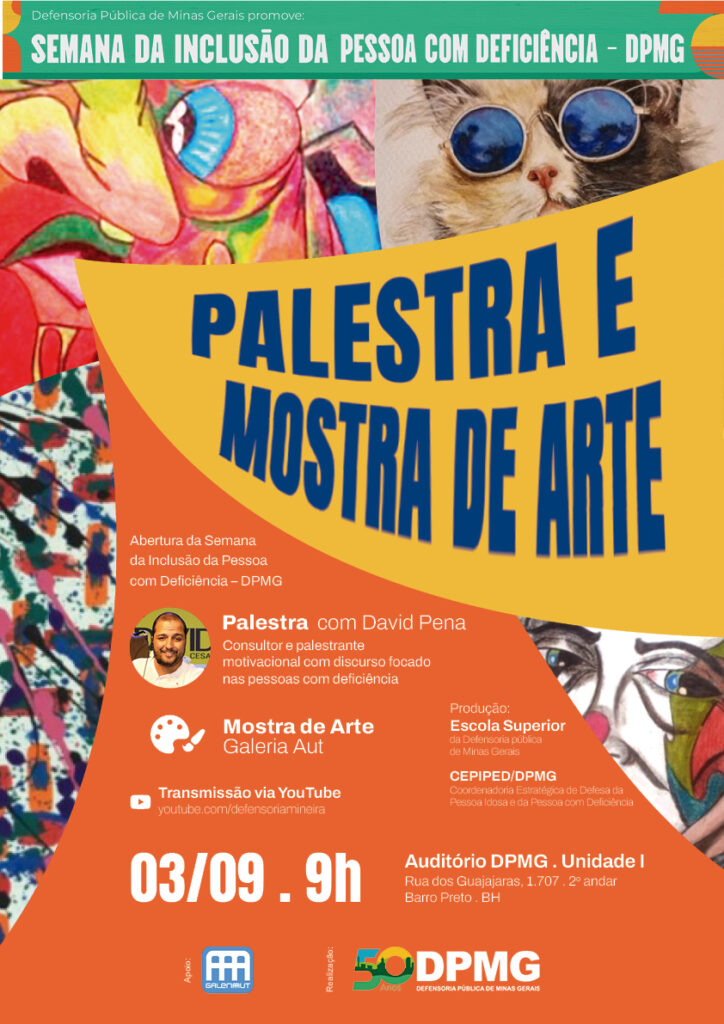 A Defensoria Pública de Minas Gerais (DPMG), por meio de sua Escola Superior (Esdep) e da Coordenadoria Estratégica de Promoção e Defesa dos Direitos da Pessoa Idosa e da Pessoa com Deficiência (CEPIPED), promove, no dia 3 de setembro de 2025, das 9h às 12h, uma palestra com David Pena e uma exposição de arte da Galeria Aut, em evento presencial que marca a abertura da Semana da Inclusão da Pessoa com Deficiência na instituição. O evento será realizado no auditório da DPMG, localizado na Rua dos Guajajaras, 1707 – Barro Preto, 2° andar.