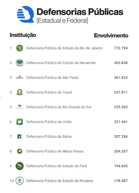 Além das Defensorias Públicas, o Social Media Gov também classificou instituições públicas de diferentes esferas e poderes como Câmaras Municipais, Legislativo, Judiciário, demais instituições de Justiça, entre outras.
