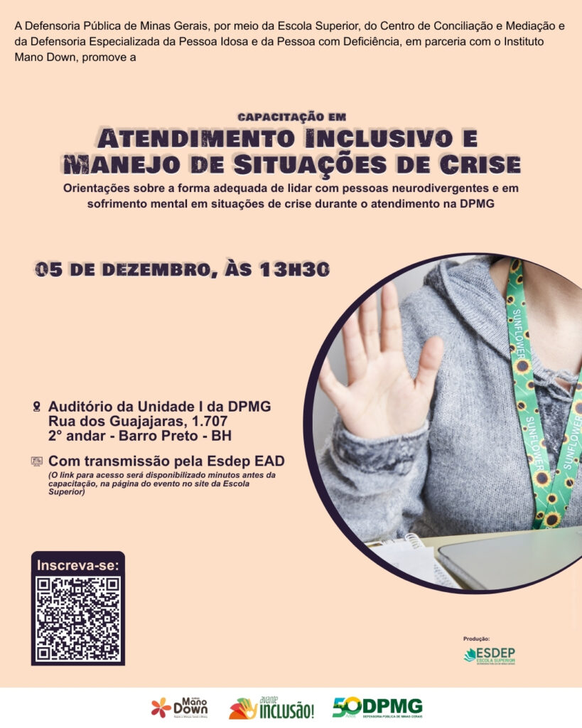 A Defensoria Pública de Minas Gerais realiza, no dia 5 de dezembro, às 13h30, a capacitação “Atendimento Inclusivo e Manejo de Situações de Crise”, iniciativa que reforça a diretriz institucional de qualificar o atendimento prestado à população vulnerável. A formação ocorrerá no auditório da Unidade I, na Rua dos Guajajaras, 1.707, 2º andar, Barro Preto, em Belo Horizonte, com transmissão simultânea pela Esdep EAD.