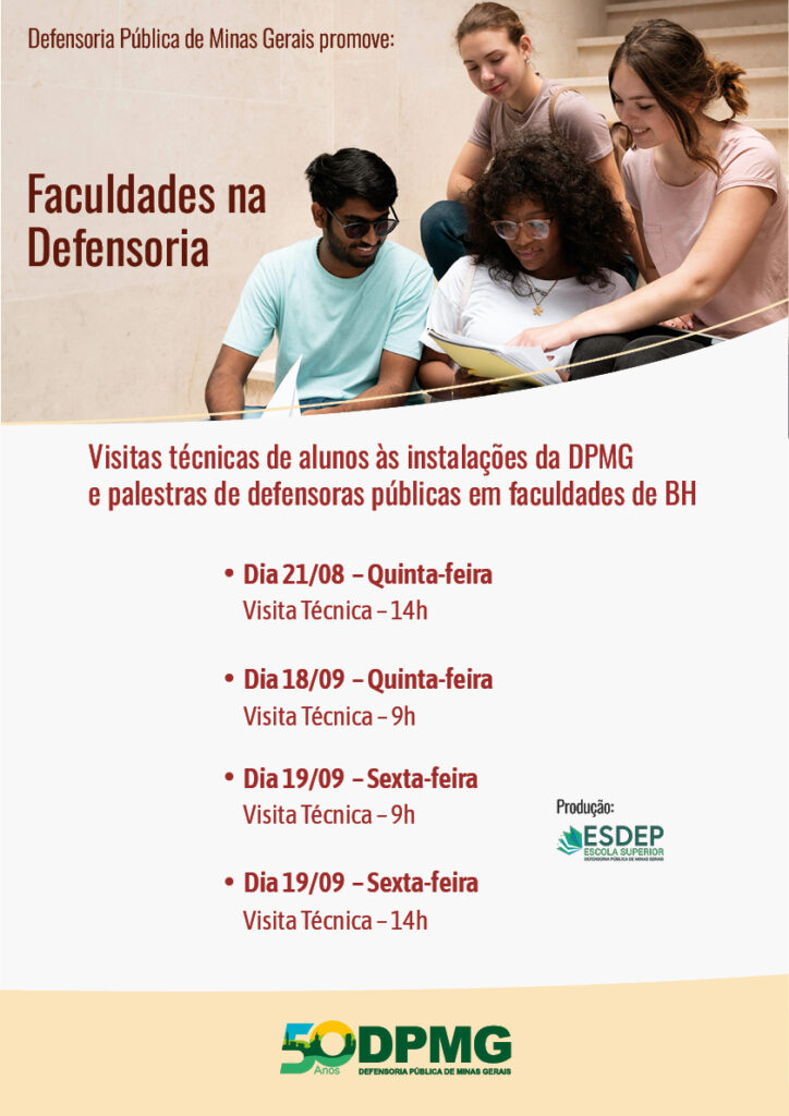 Nos dias 21 de agosto e, 18 e 19 de setembro, a Defensoria Pública de Minas Gerais (DPMG), em Belo Horizonte, promove mais uma vez o projeto Faculdades na Defensoria.
