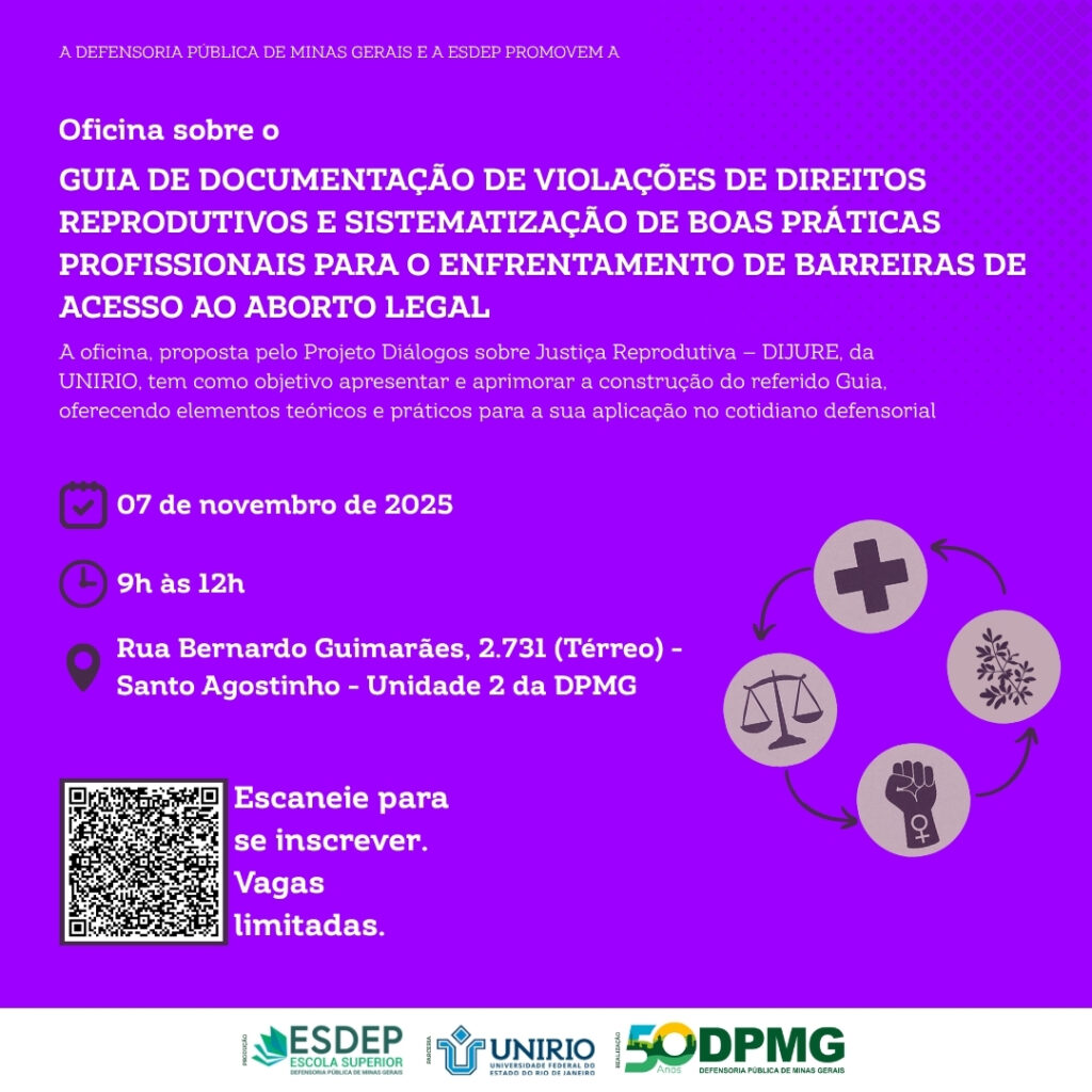 A Escola Superior da Defensoria Pública de Minas Gerais (Esdep-MG) sedia, no dia 7 de novembro de 2025, das 9h às 12h, a Oficina “Guia para documentação de violações de direitos reprodutivos e sistematização de boas práticas profissionais para o enfrentamento de barreiras de acesso ao aborto legal”, promovida pelo Projeto Diálogos sobre Justiça Reprodutiva (DIJURE), da Universidade Federal do Estado do Rio de Janeiro (UNIRIO).