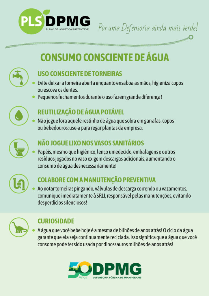 Na Defensoria Pública de Minas Gerais, o compromisso com o uso responsável da água integra as metas do Plano de Logística Sustentável (PLS), que busca implementar práticas cotidianas capazes de reduzir impactos ambientais, otimizar recursos e fortalecer a cultura da sustentabilidade na instituição.