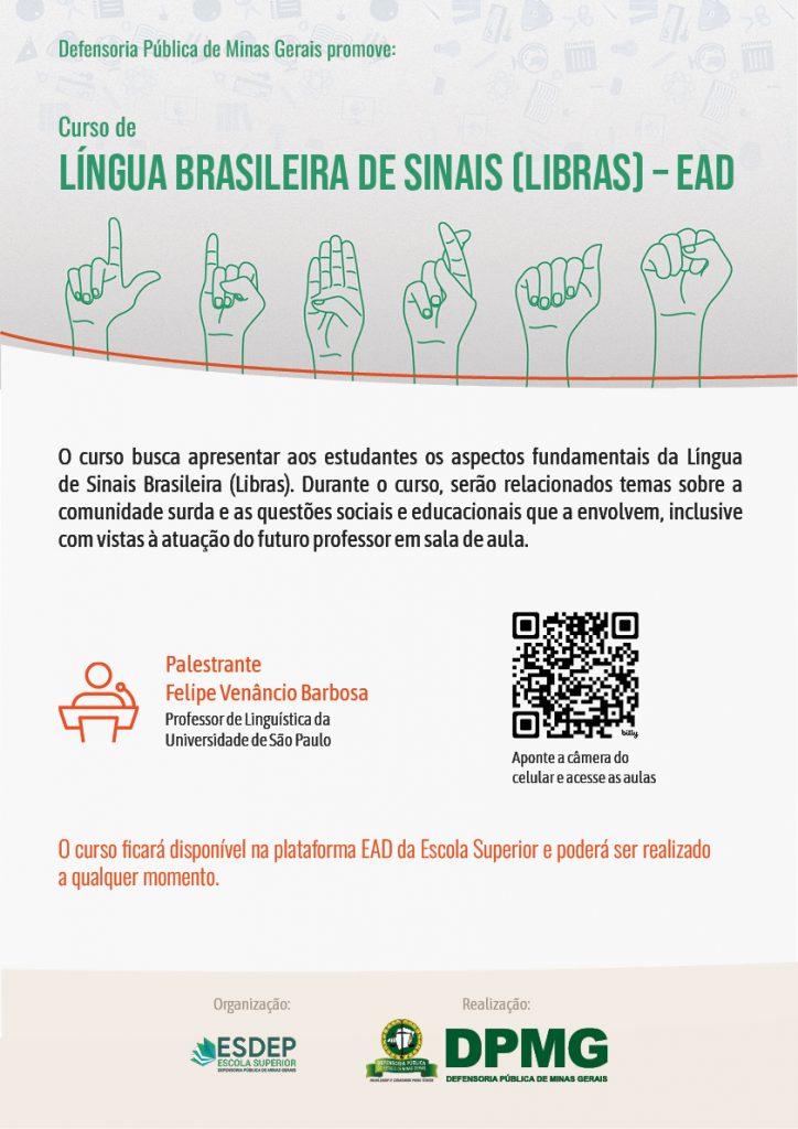 A Defensoria Pública de Minas Gerais (DPMG), por meio de sua Escola Superior (Esdep), em parceria com a Universidade de São Paulo, está disponibilizando um curso de Língua Brasileira de Sinais (Libras) na modalidade de Ensino a Distância (EAD). Voltado para defensoras e defensores, servidores e servidores, estagiários e estagiários, terceirizados e terceirizados da instituição, o curso tem como objetivo apresentar os aspectos fundamentais da Libras, abordando temas relacionados à comunidade surda e às questões sociais e educacionais envolvidas.