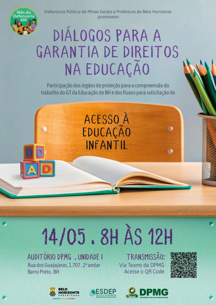 A Defensoria Pública de Minas Gerais (DPMG), por meio da sua Escola Superior (Esdep), em parceria com a Prefeitura de Belo Horizonte, realiza no dia 14 de maio, das 8h às 12h, o evento “Diálogos para a Garantia de Direitos na Educação – Acesso à Educação Infantil”. A atividade integra a programação comemorativa do Mês da Defensoria e ocorrerá em formato híbrido. Presencialmente no auditório da Unidade I da DPMG (Rua dos Guajajaras, 1.707 – 2º andar, Barro Preto – BH), com transmissão simultânea pela plataforma Teams da DPMG.