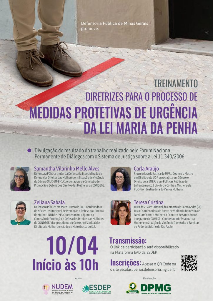 A Defensoria Pública de Minas Gerais, por meio da sua Escola Superior (Esdep-MG), promoverá no dia 10 de abril, a partir das 10h, o treinamento “Diretrizes para o Processo de Medidas Protetivas de Urgência da Lei Maria da Penha”. O evento visa divulgar os resultados do trabalho realizado pelo Fórum Nacional Permanente de Diálogos com o Sistema de Justiça sobre a Lei 11.340/2006, que estabelece mecanismos para coibir a violência doméstica e familiar contra a mulher.