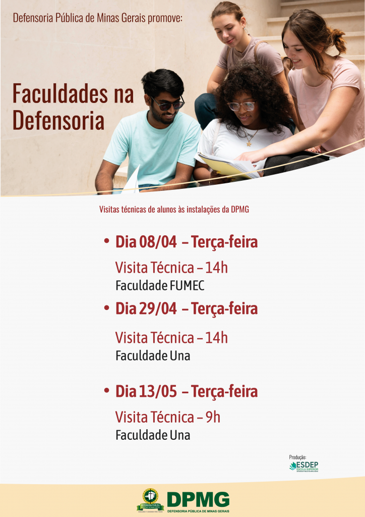 Nos dias 8 e 29 de abril e 13 de maio, a DPMG em Belo Horizonte promove mais duas edições do projeto “Faculdades na Defensoria”. No período serão realizadas a visita técnica de estudantes de faculdades mineiras para que conheçam a atuação da Instituição, infraestrutura e público atendido.