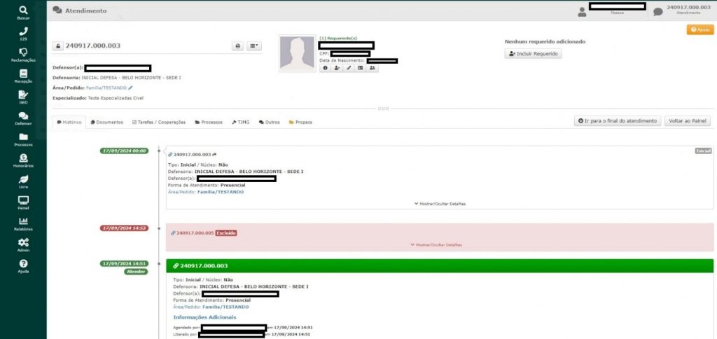 O painel de atendimento traz todas as informações relacionadas à assistida e ao assistido dentro da Defensoria Pública, assim como os processos em tramitação na Justiça
