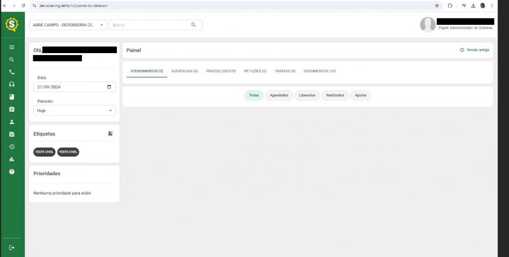 O painel da usuária e do usuário do sistema é definido de acordo com o perfil de cada um, seja defensora e defensor público, assessora e assessor, servidora e servidor ou estagiária e estagiário