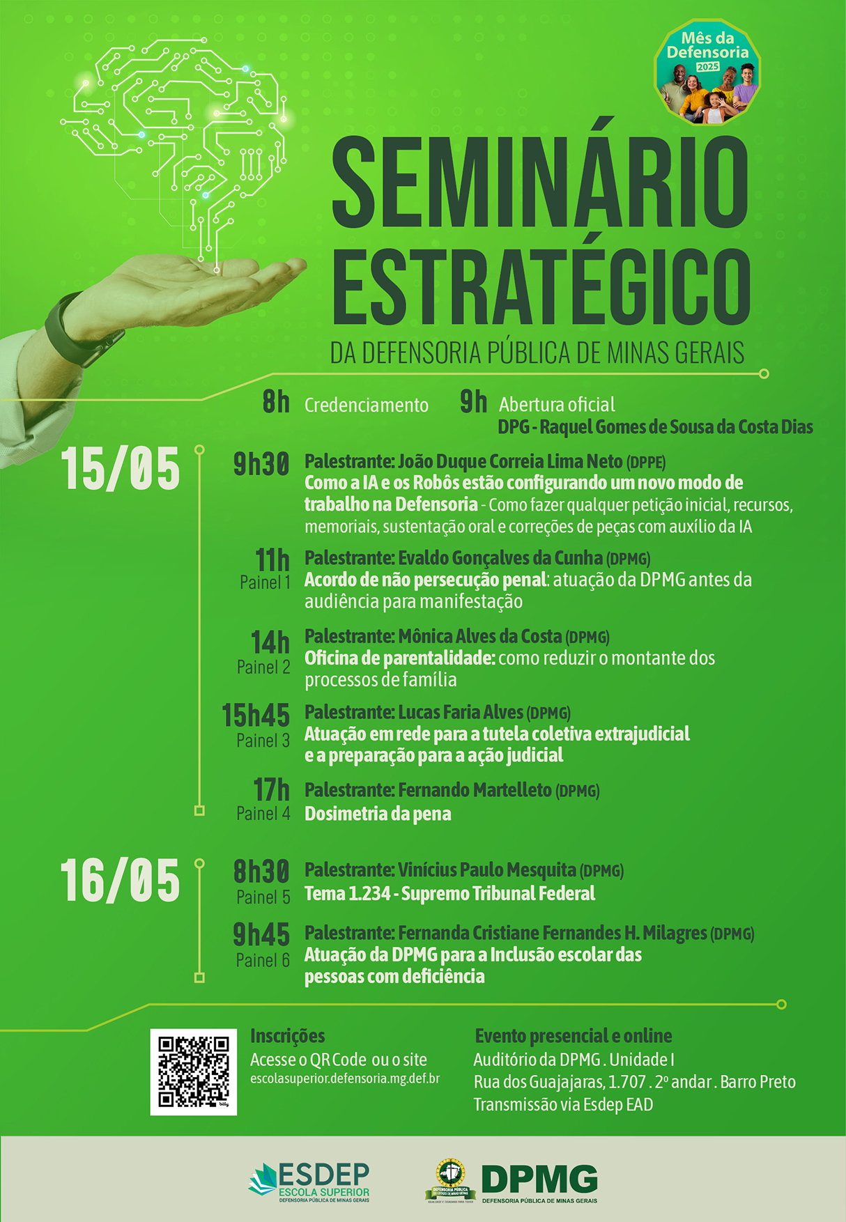 A Defensoria Pública de Minas Gerais, por meio da sua Escola Superior, em comemoração ao mês da Defensoria Pública, promove o “Seminário Estratégico da DPMG”, nos dias 15 e 16 de maio de 2025. O evento acontecerá de forma presencial, no Auditório da DPMG – Unidade I, localizado na Rua dos Guajajaras, 1.707, 2º andar, no bairro Barro Preto, em Belo Horizonte, com transmissão simultânea pela plataforma da Esdep EAD.