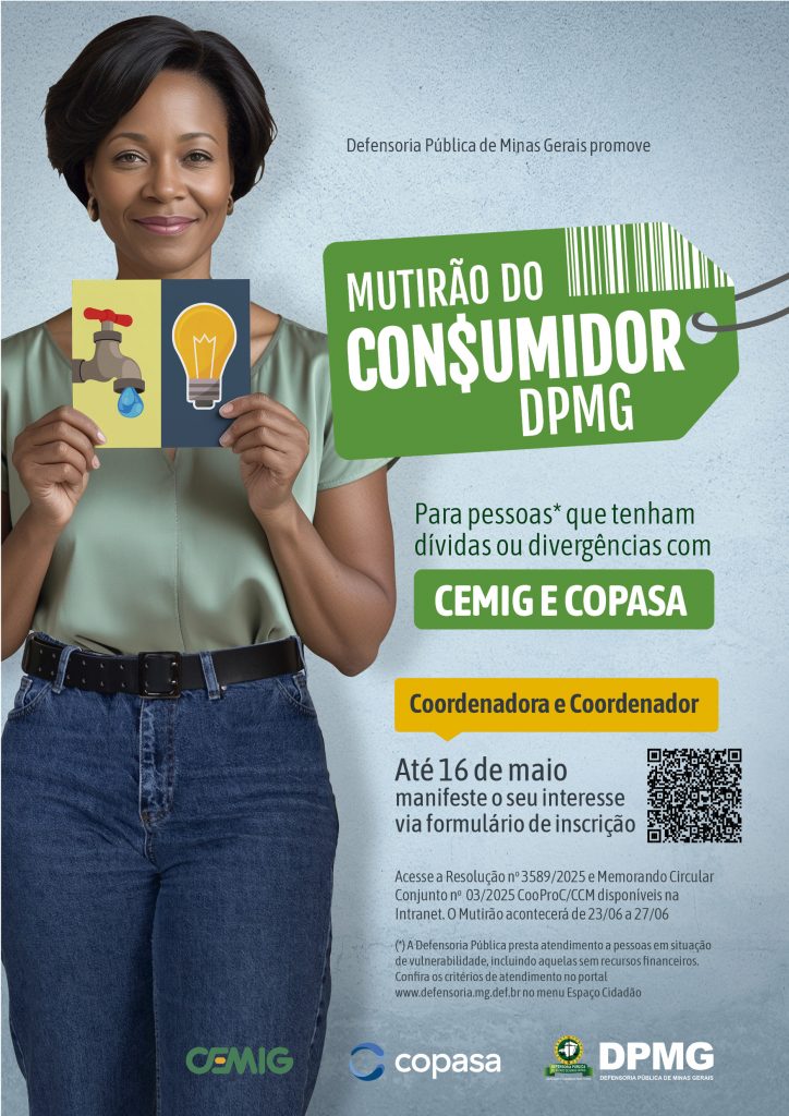 Com o objetivo de promover a resolução extrajudicial de conflitos decorrentes de relações de consumo com as concessionárias Cemig e Copasa, a Defensoria Pública de Minas Gerais vai realizar em âmbito estadual o Mutirão do Consumidor 2025.