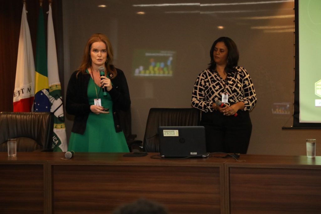 A terceira e última atividade do evento foi a apresentação da “Gestão Pública sustentável: resultados e desafios da Assembleia Legislativa de Minas Gerais (ALMG)”, conduzida pela coordenadora do Comitê de Sustentabilidade da instituição, Maria Luiza Meinberg, e pela assessora da Diretoria de Infraestrutura, Ludmila Alves.